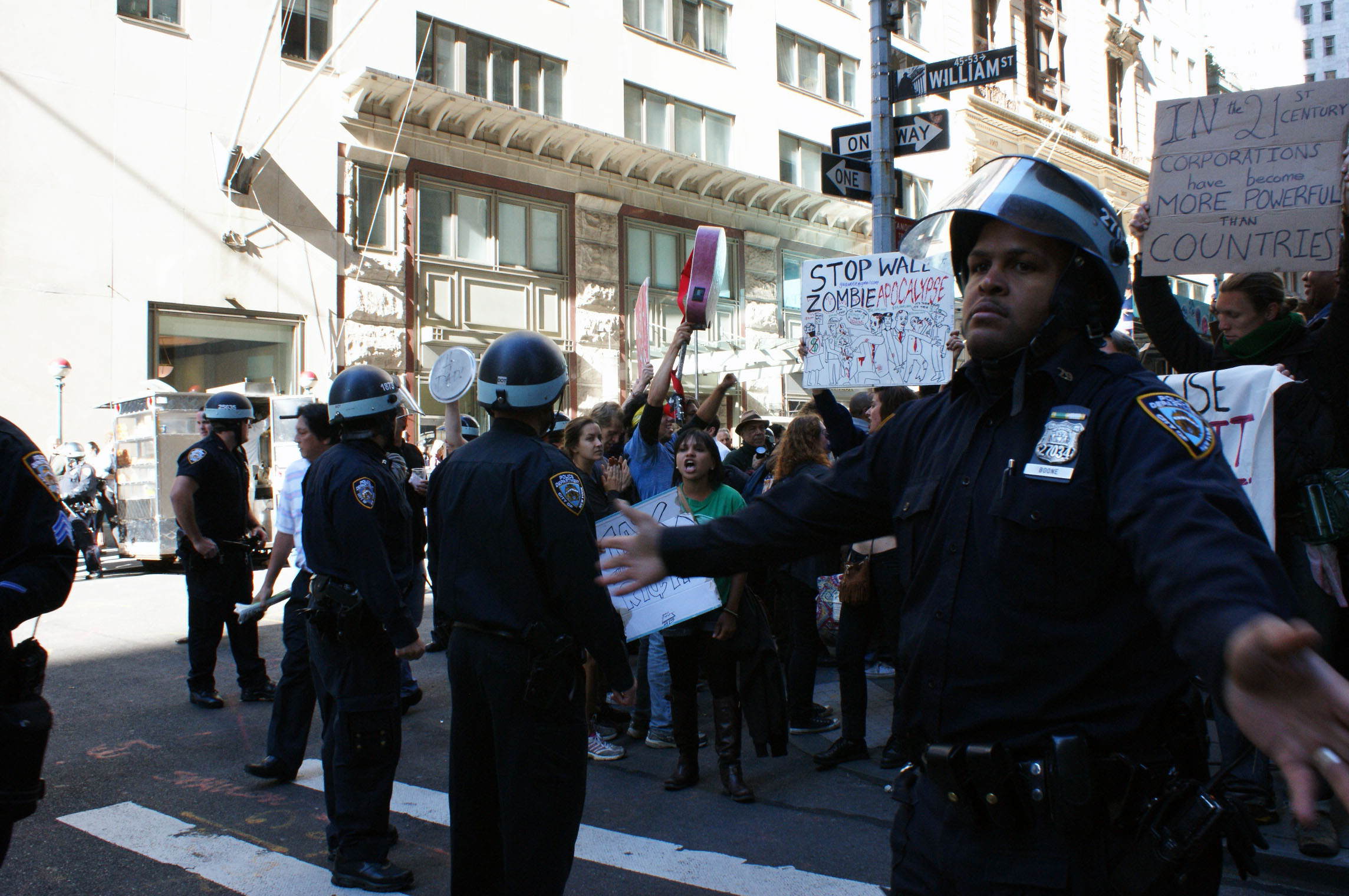 Sound bounced off walls in the financial district and I clutched my camera with authority. I rounded a corner to find five police officers huddling around a man they arrested. A Brooklyn college student stood off to the side as he filmed the arrest and franticly explained how the man had been unfairly detained.
