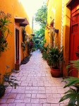 The front of hotel Casa Tia Micha displays a modest open door leading into an entry way where faded black and white photos of people who have long past hang upon the old adobe wall. The floor is tiled, varies shades of brown and light reflecting off dark wood displays warm undertones. Antique lighting hangs from tall ceilings as we walk through a hallway with walls adorned with succulents, flowers, plants and colorful doors which lead to a stairway up to the rooms.