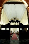 San Servacio, a towering church built in 1545, looms in the night sky over the town’s main plaza with lit structural bends highlighted with an orange glow. A woman walks out of a smaller door within the giant church door and from behind iron bars a man prays on his knees in front of an alter as headstones line the walls around him.