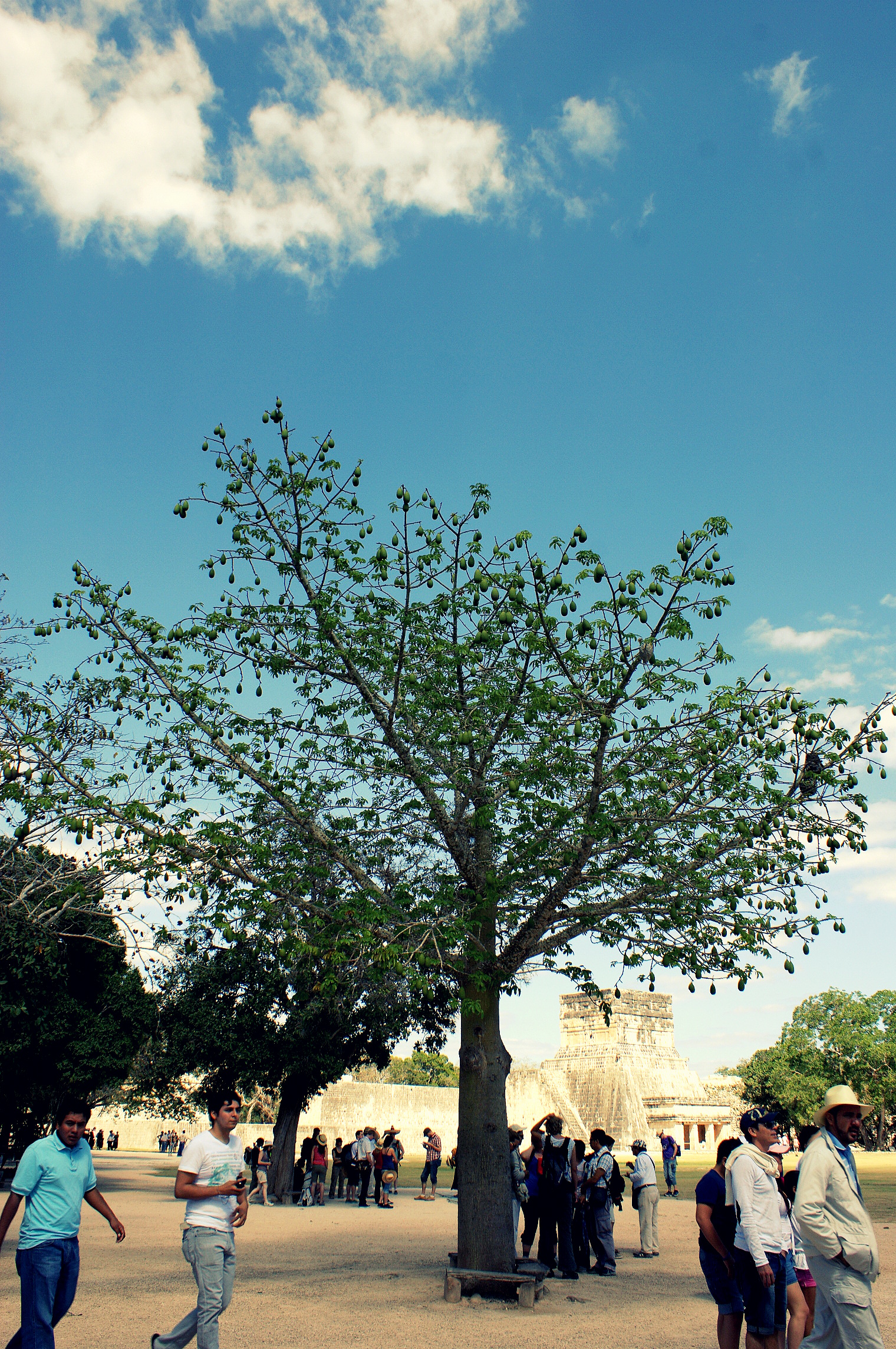 Mayan Cotton TreeGuillermo (William), our tour guide, led us to the front of the ruin entrance as we stood next to a Mayan cotton tree. Its thick swollen trunk held layered branches covered with wart-like thorns. Green water balloons of cotton seed hung from the branches like a chandelier. To the Mayans, the branches represent the different stages of heaven. Its roots are the underworld.
