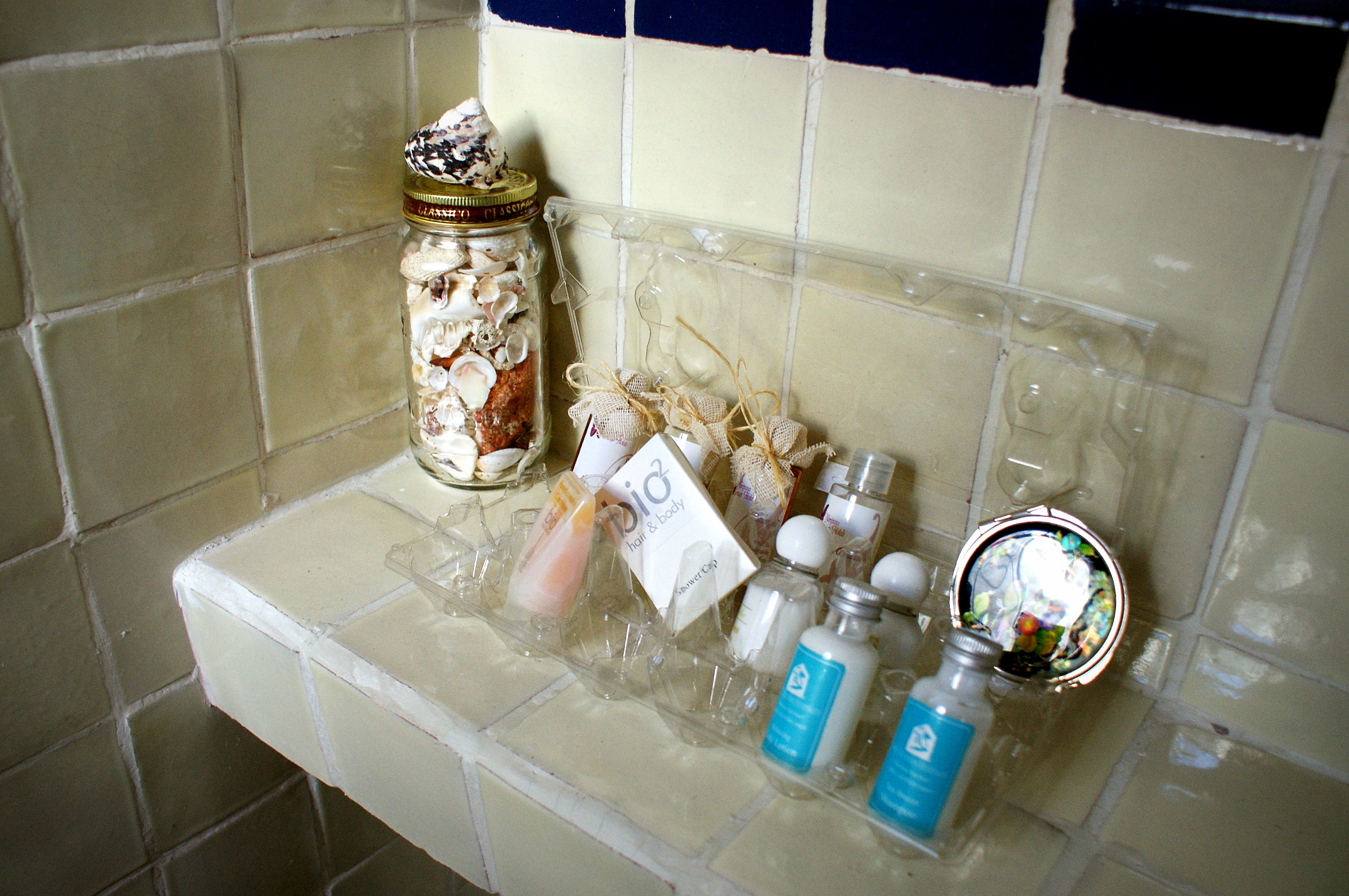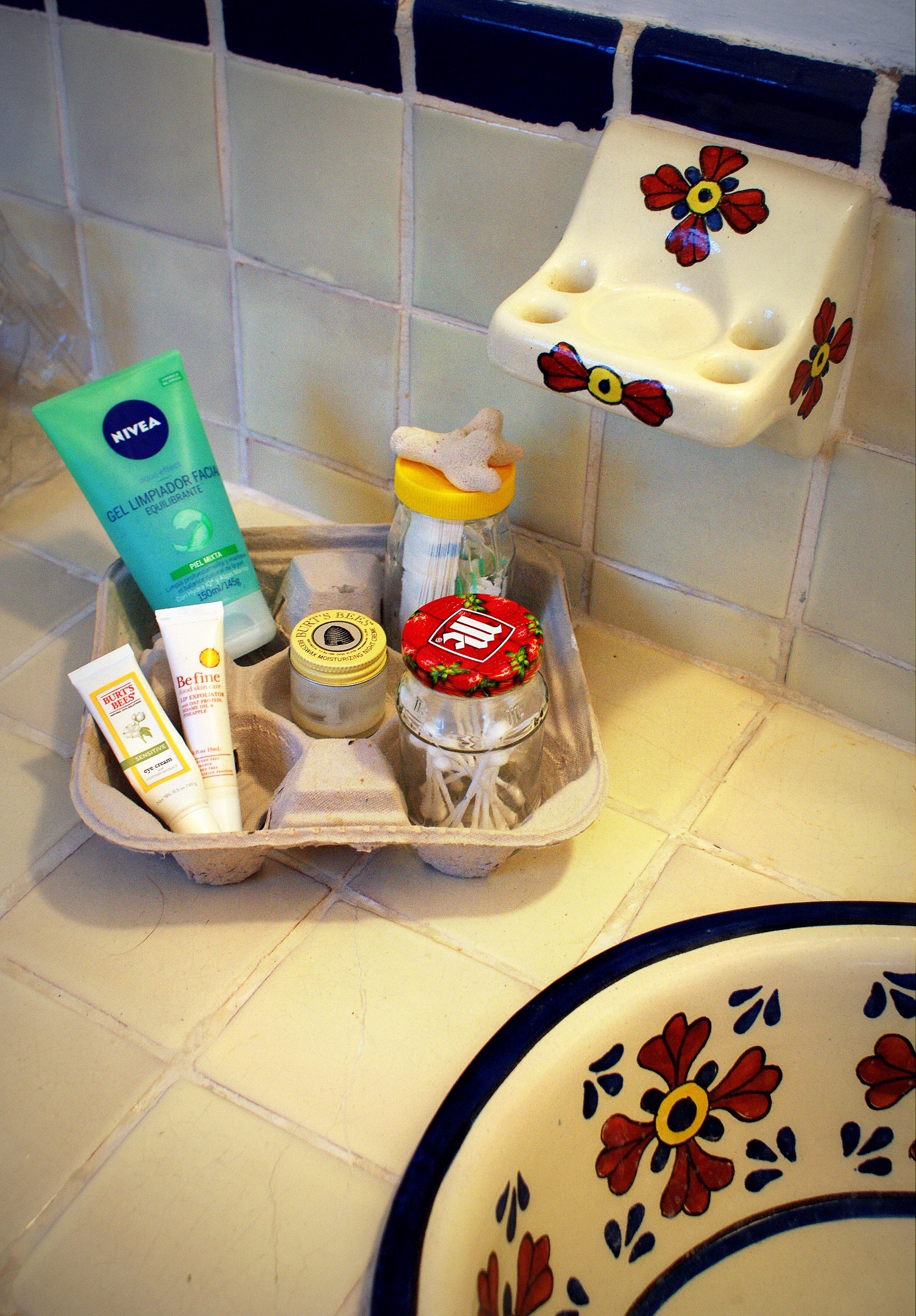 A plastic egg carton as a holder for travel toiletries for guests.