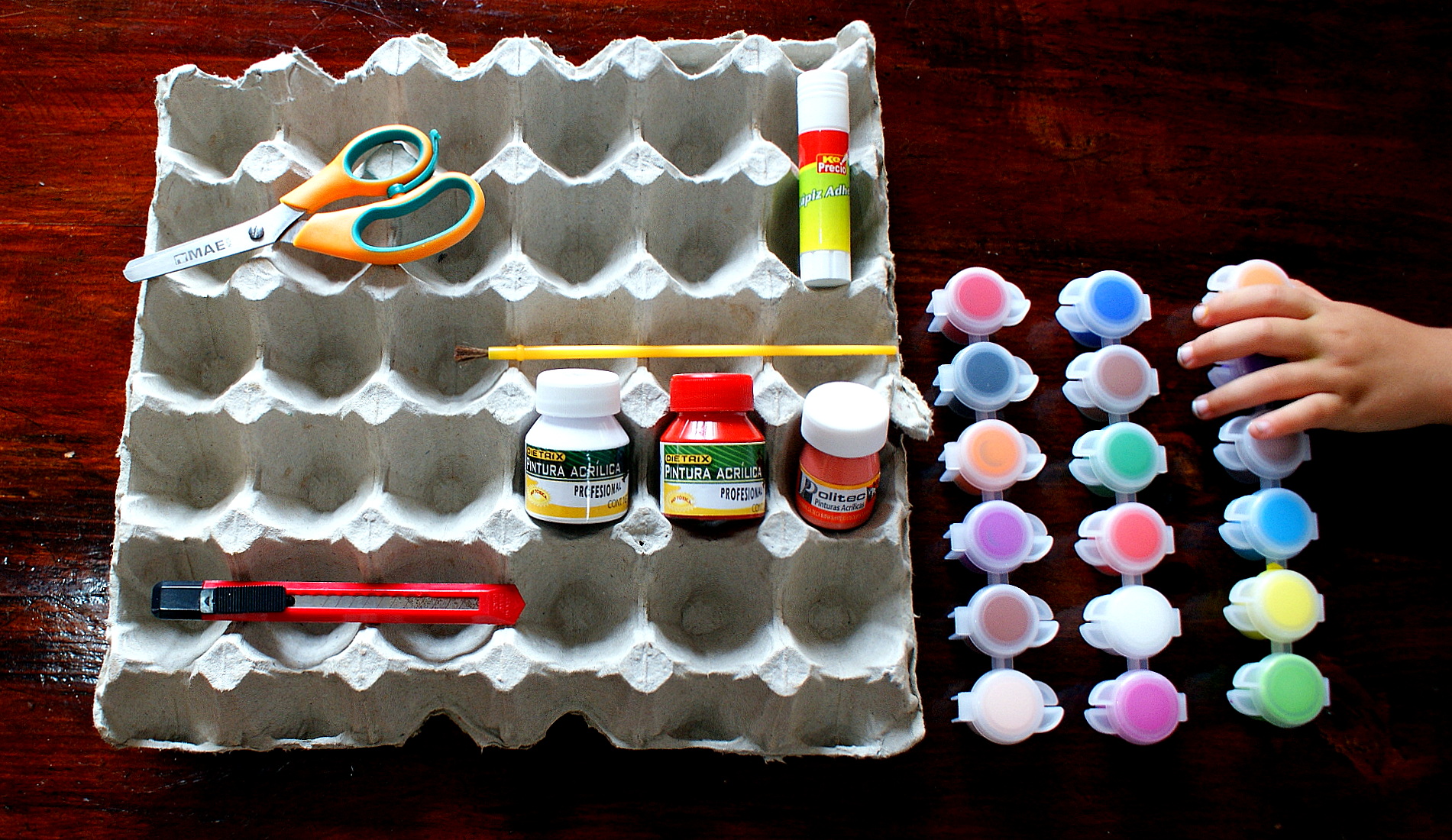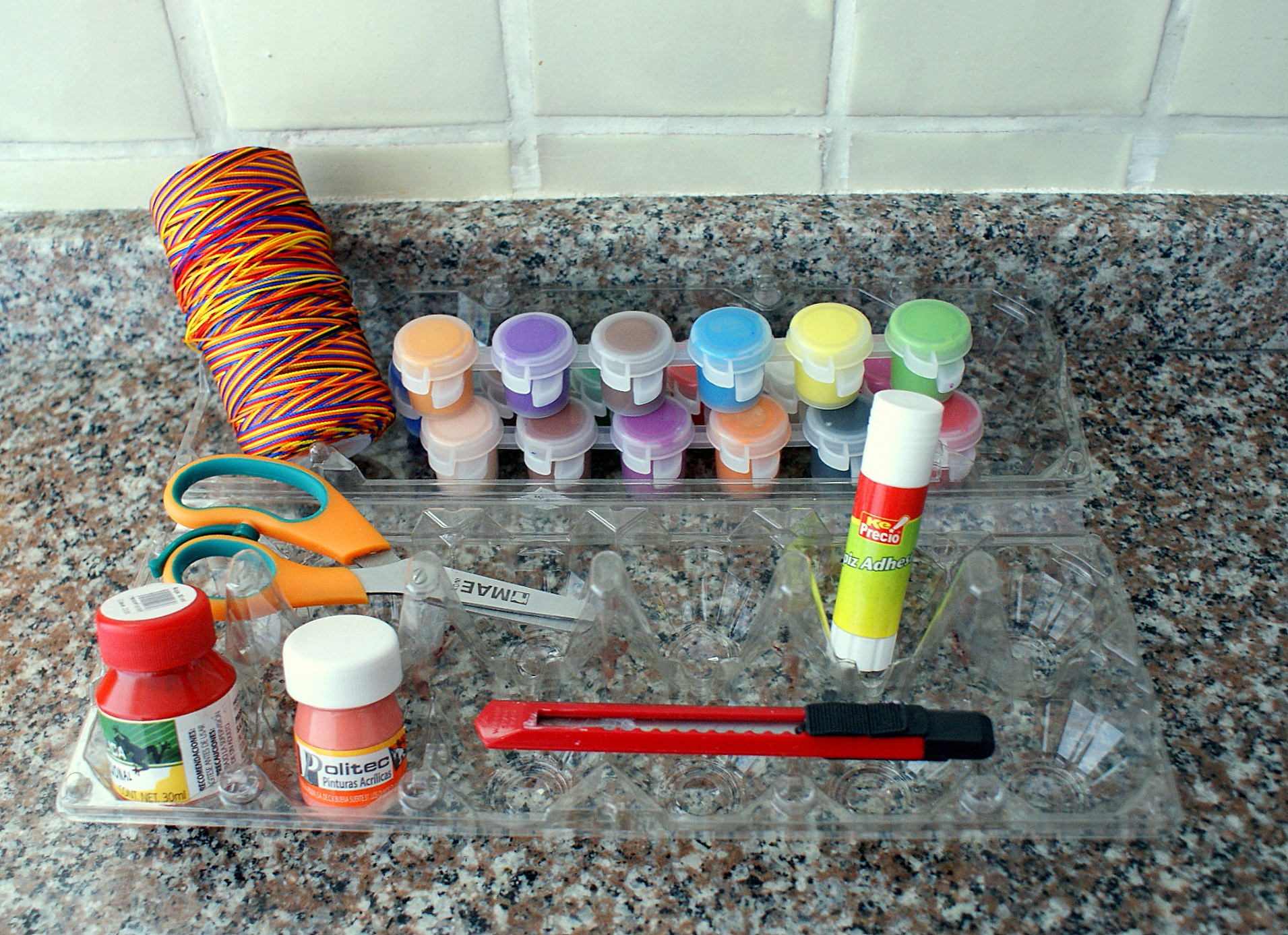 A plastic egg carton as a holder for art supplies.