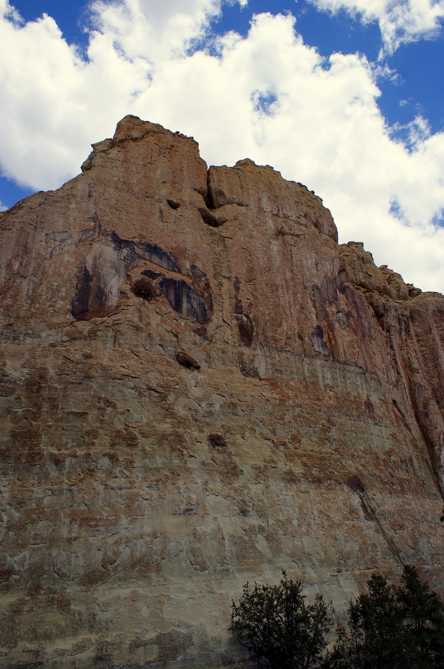Stepping out on the paved path, high mesa walls loomed in a cotton ball cloud-filled, blue sky.