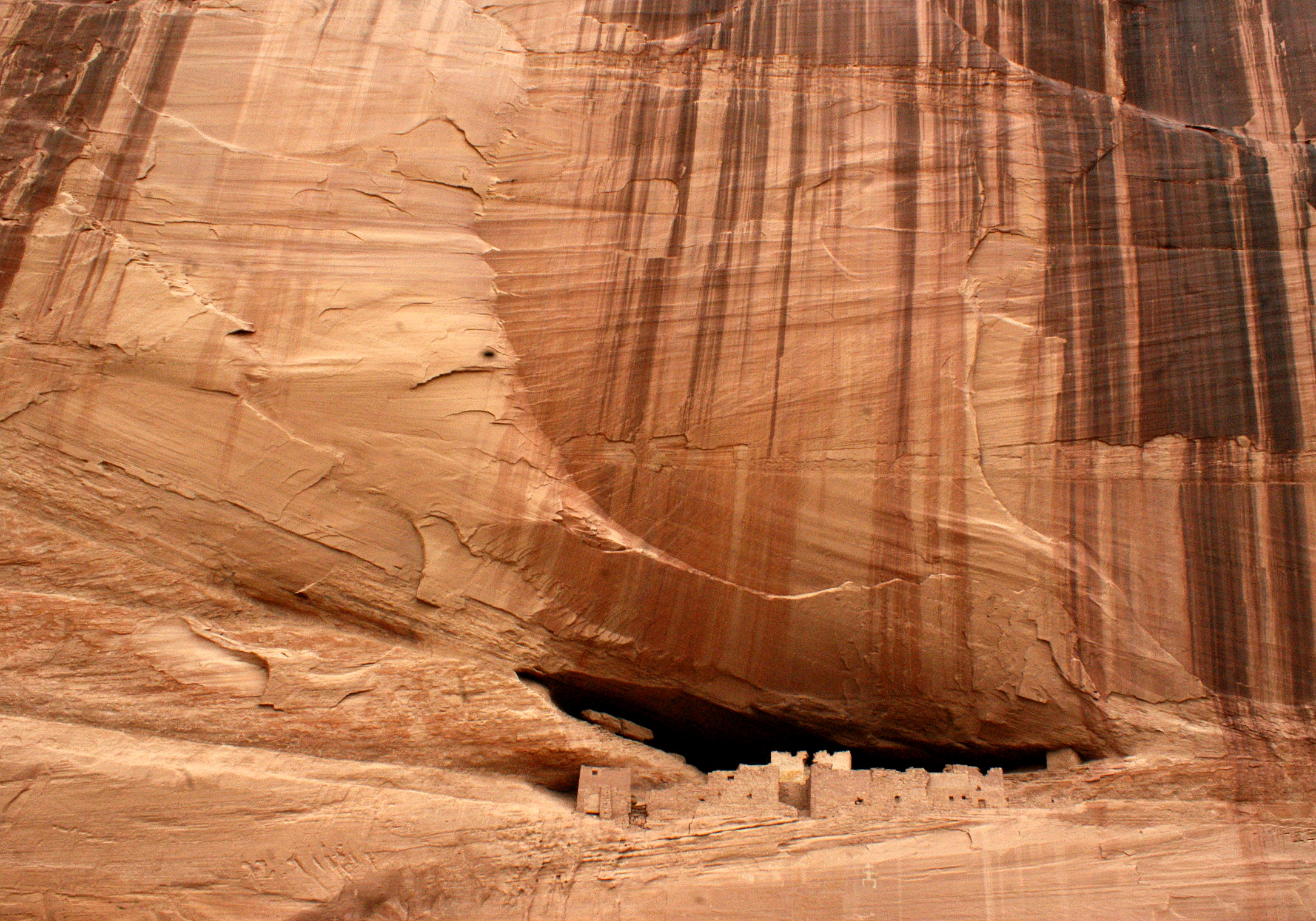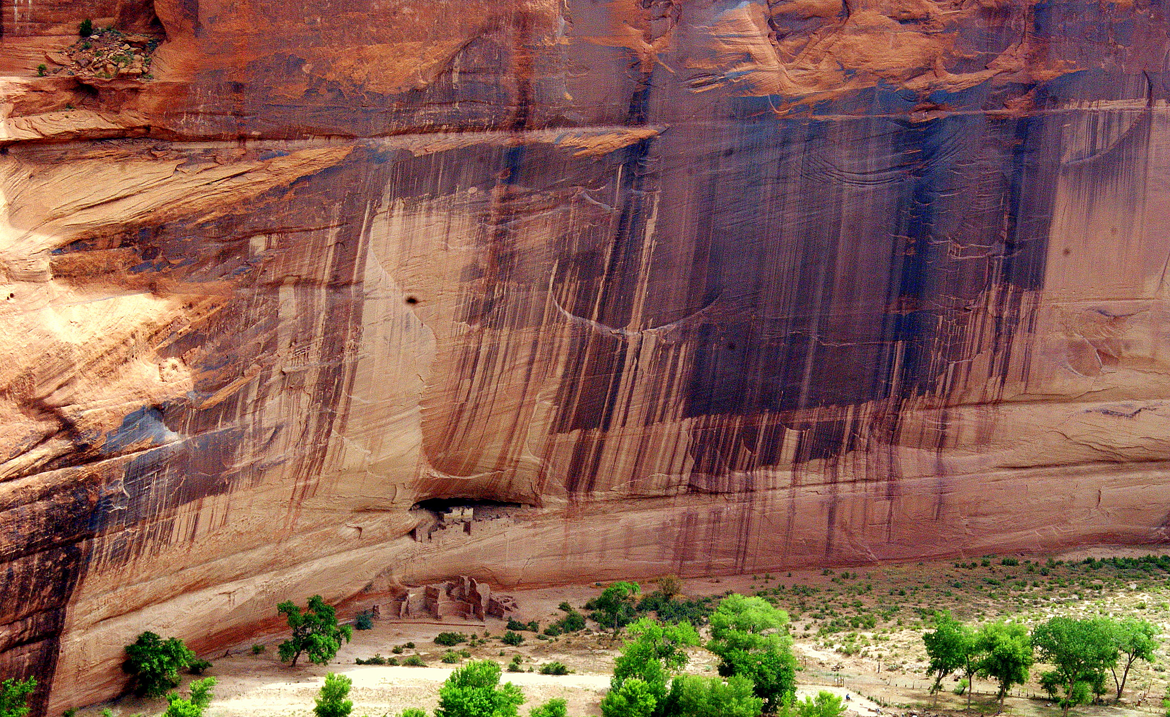 Black streaks remained as stuck-in-time drips that oozed down the reddish sandstone walls above the White House Ruins. The streaks are actually desert varnish, which are formed by seeping water, which reacts with iron in the sandstone.