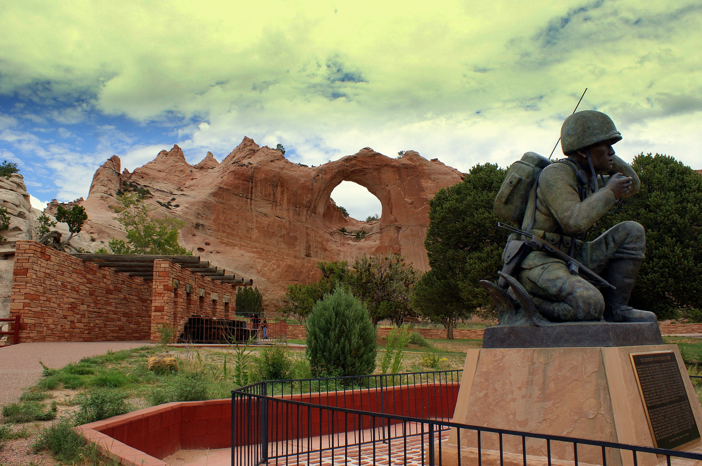 A Veterans Memorial sits at the base of Window Rock to honor the many Navajos who served in the U. S. military. Navajo soldiers are recognized for their role as Code Talkers, whereby they used the Navajo language to create a code that was never broken by the enemy.