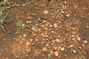 The muddy ground was littered with broken shards of brown clay pottery. The pottery created by the people who occupied the village were mostly jar-shaped vessels not decorated with designs.
