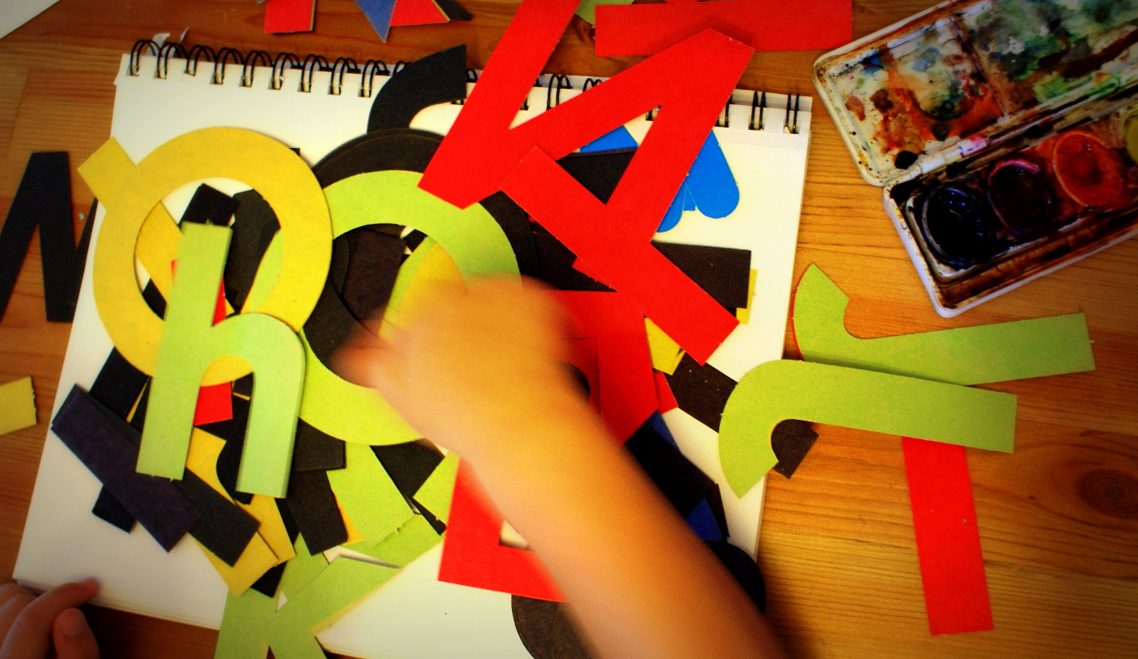 My son is always pleading with me to sit down and watch him create something. He spotted the colorful bag of letters I found at the thrift store and stated that he wanted to create art with the alphabet.