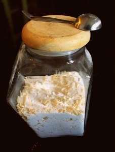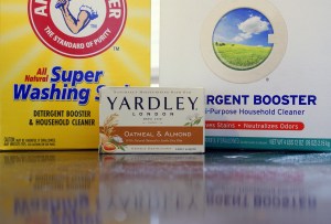Grate a bar of soap or mix in food processor until finely ground. Use the soap of your choice. I used Yardley Oatmeal and Almond Soap. It’s natural and smells delicious.