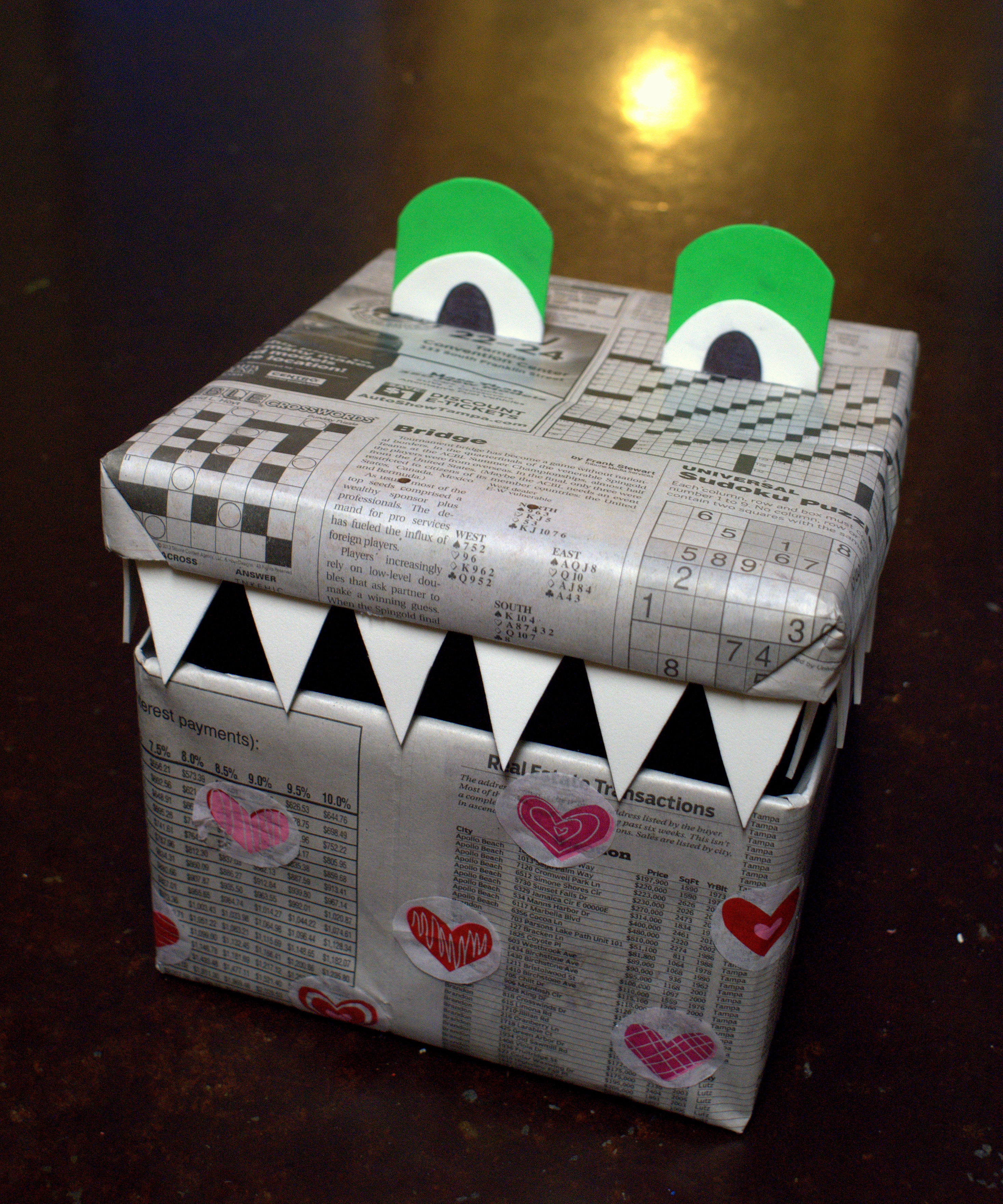 Instead of the same ‘ol shoebox cut in the top I decided to get creative and get monster with it. He’s super low maintenance and lives off of love letters!