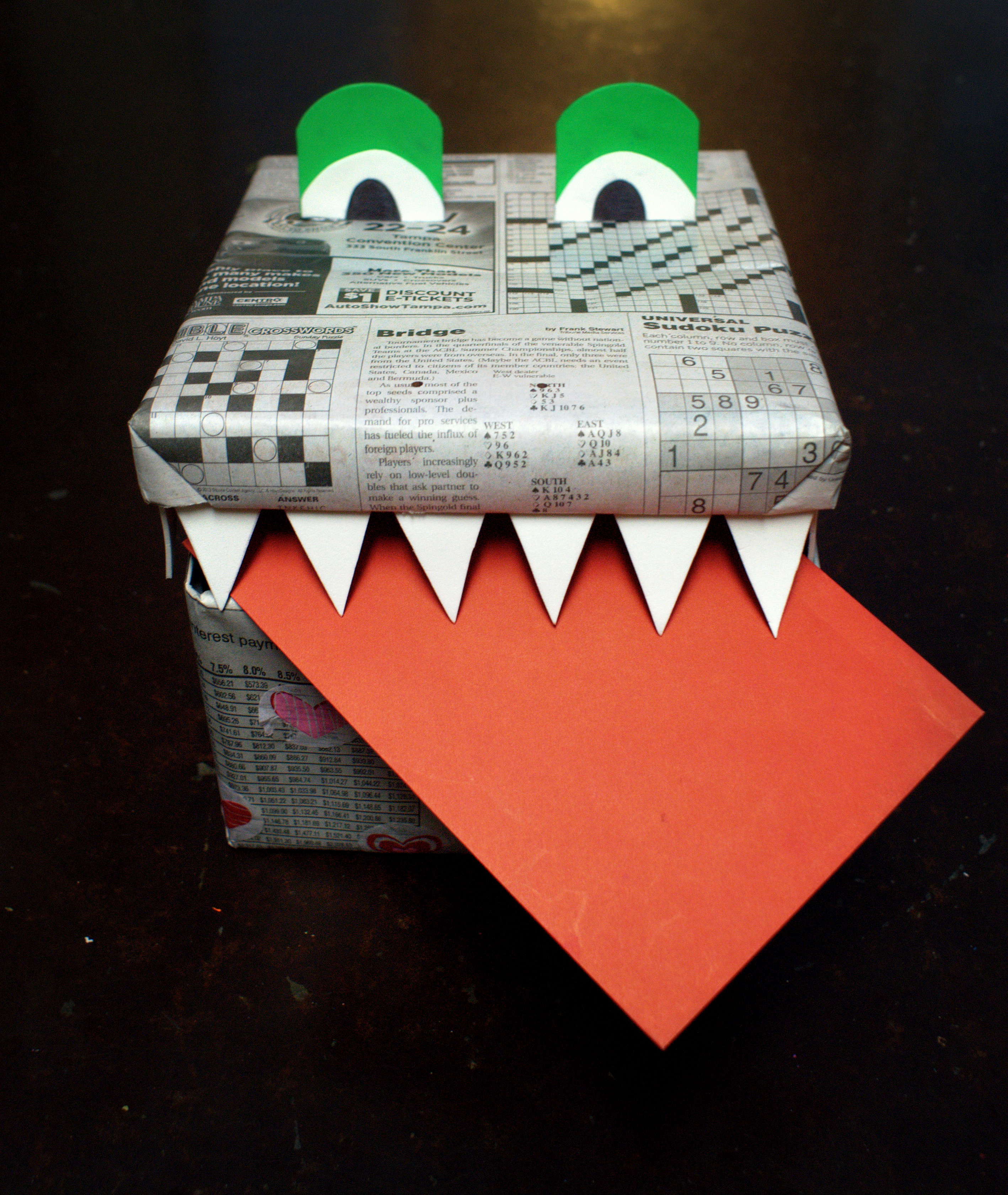 Wrap the Ikea file box and lid with newspaper using tape to secure it. Cut circles out of the tissue paper and glue them on the box. Make the eyes by gluing the foam on the back of a piece of cardboard. Use pen for the eyeballs. Cut out teeth and hot glue gun them to the inside of the lid. Hot glue gun the lid to the base so that the “mouth” is slightly open.